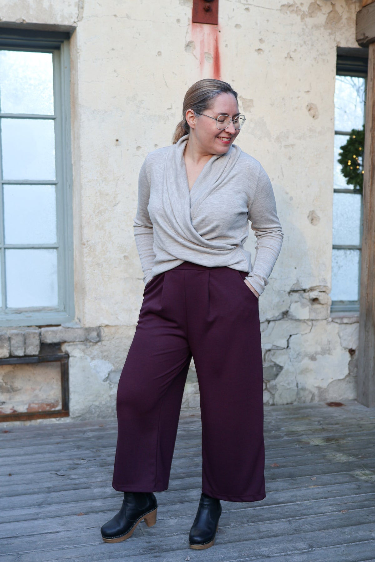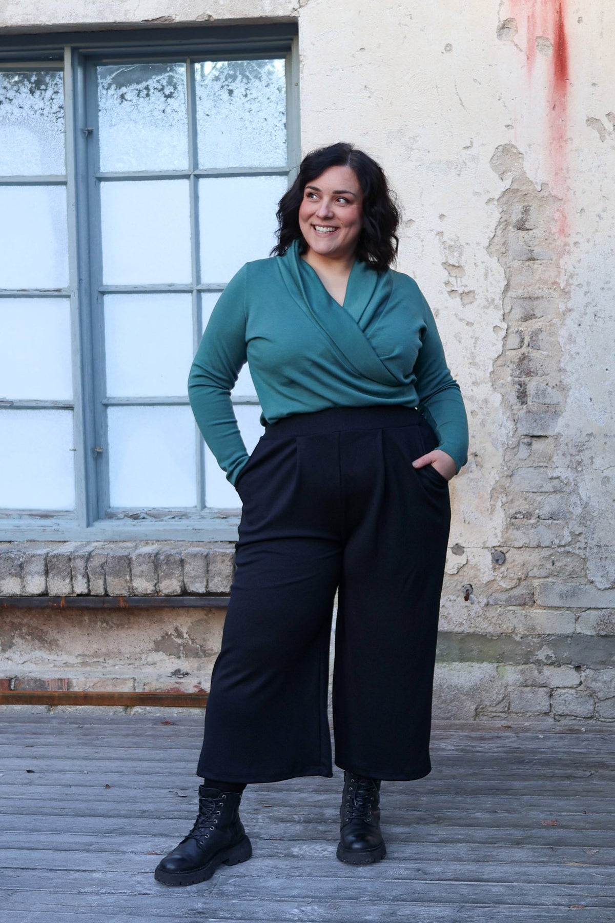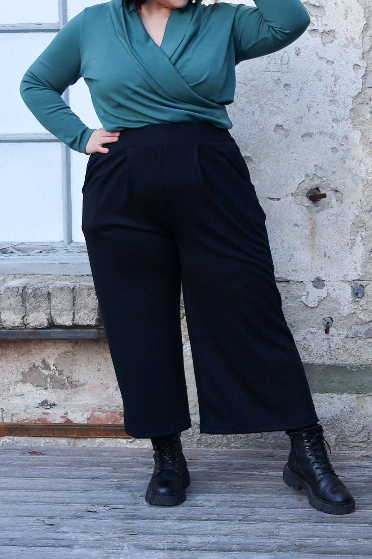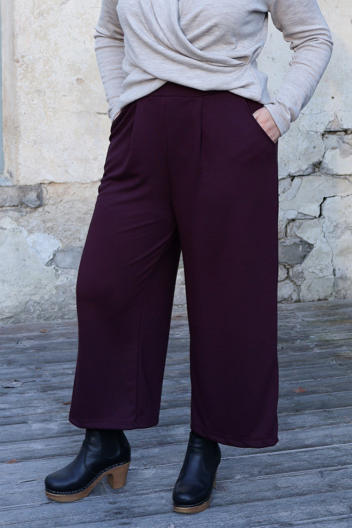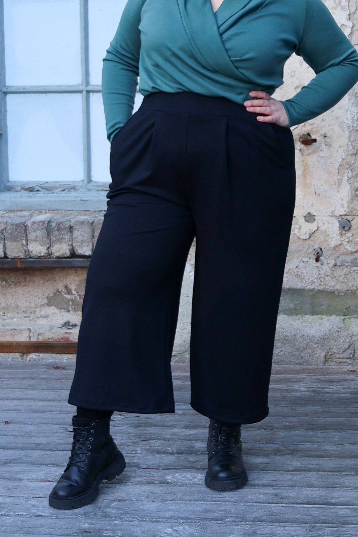 Tyylikkäät ja helpot culottes-housut, jossa leveä kuminauhavyötärö ja taskut. Vyötäröllä on edessä kaksi laskosta. Nämä ihanat housut sopivat niin arkeen kuin juhlaan, vuodenajasta riippumatta. Talvella voit pukea alle sukkikset ja laittaa jalkaan vaikkapa maiharit. Juhlavan yläosan kanssa housut sopivat hyvin myös fiinimpään menoon.