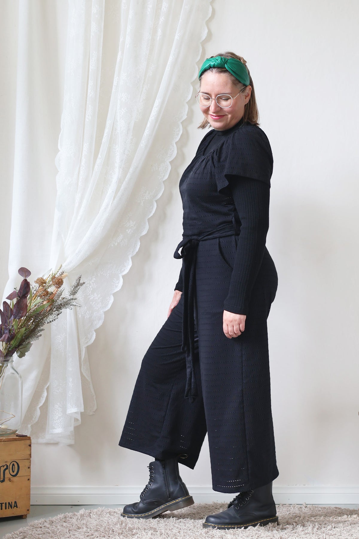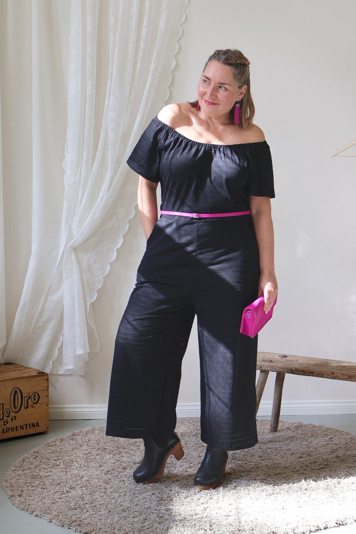 Tämä supersuosittu haalari on ollut jo monen asiakkaan unelmavaate ja nyt se on saatavilla supersuositussa "reikäraita" neuloksessa! Musta Jasmine-haalari on kivan rento, mutta samalla tyylikäs ja naisellinen. Siinä on kuminauhapääntie ja pienet, kauniit holkkihihat. Alaosana on leveälahkeiset vajaamittaiset housut. Vyötäröllä on vyölenkit, leveä vyö ja ihanan rennot taskut. Vyötä on helppo vaihtaa mieleisekseen ja tilanteeseen sopivaksi. Pääntiellä olevan kuminauhan ansiosta haalari on helppo pukea ja riisua.